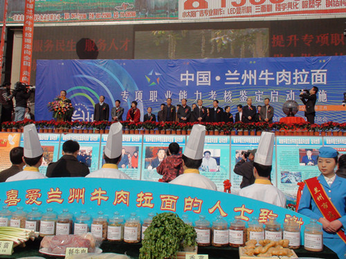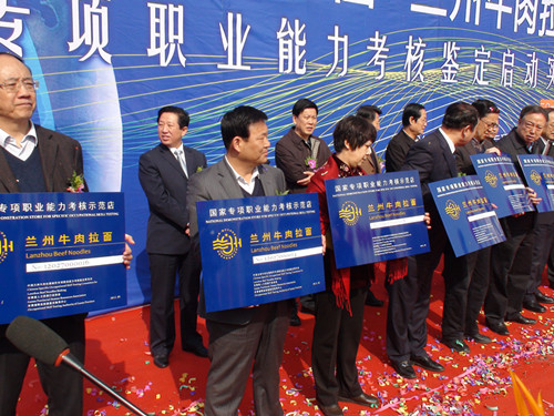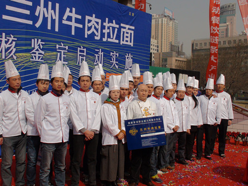 2012年3月26日,由蘭州牛肉拉面制作專項職業(yè)能力考核委員會、甘肅省人力資源行業(yè)協(xié)會、甘肅省職業(yè)技能鑒定指導(dǎo)中心聯(lián)合舉辦的“蘭州牛肉拉面制作專項職業(yè)能力考核鑒定啟動實施”盛會于蘭州東方紅廣場正式拉開幃幕。
