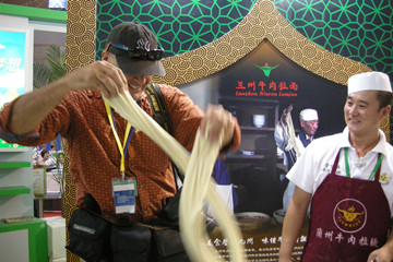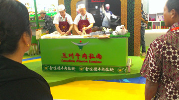 圖為各級領導、觀眾及參展商圍觀公司拉面師傅現場表演蘭州牛肉拉面