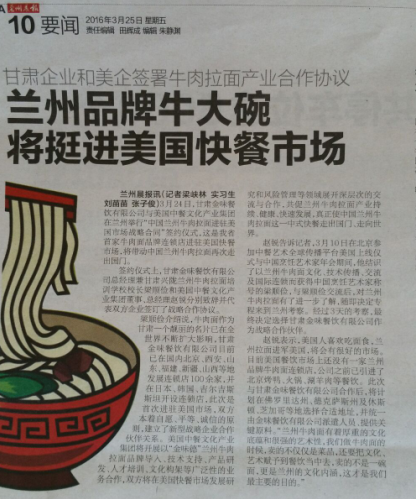蘭州晨報訊(記者梁峽林 實習生劉苗苗 張子俊)3月24日,甘肅金味餐飲有限公司與美國中餐文化產業集團在金城蘭州舉行“中國蘭州牛肉拉面進駐美國市場戰略合同”簽約儀式,這是我省首家牛肉面品牌連鎖店進駐美國快餐市場,將帶動中國蘭州牛肉拉面再次走出國門,實現中美兩國餐飲企業跨越式發展。