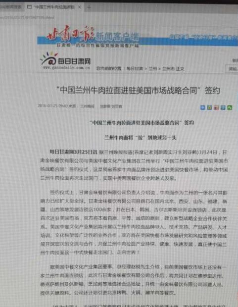 中美蘭州牛肉拉面產業發展戰略合作成功簽約 蘭州牛肉面將進駐美國市場