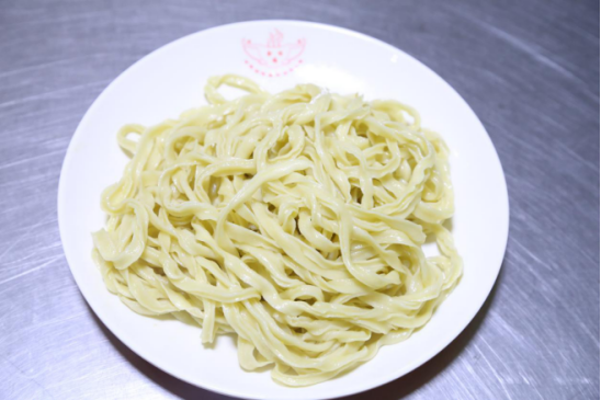 2、韭葉扁形面條,韭菜葉的形狀,寬約4~5mm,一般六手成型。溫潤透明,纖薄而不粘連。口感精滑明麗,為喜愛扁形面條的食客所喜愛。