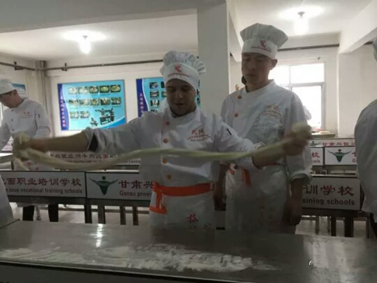 蘭州牛肉面大學堂里,西班牙青年吳榮剛(Terry Wu)在一群中國學員中格外惹眼。他手中的面團經過揉、搓、遛、扯、抻后,十幾秒的時間變魔術般把一個白面團拉成了細滑如絲的面條。
