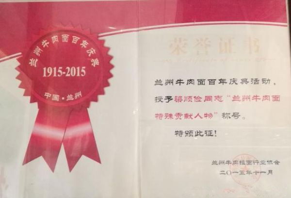 中國(guó)餐飲牛肉拉面行業(yè)貢獻(xiàn)者榮譽(yù)證書