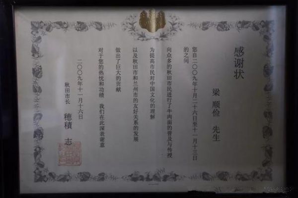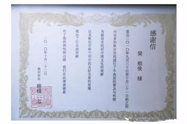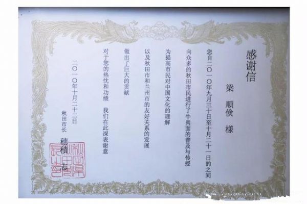 2009、2010年兩年,梁順儉先生代表中國(guó)-蘭州作為蘭州牛肉面文化交流大使赴日本秋田進(jìn)行蘭州牛肉拉面文化技術(shù)交流,推動(dòng)蘭州牛肉拉面文化的國(guó)際化發(fā)展。