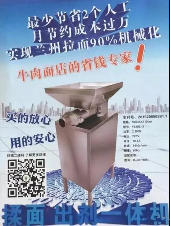 近年來,蘭州牛肉面產(chǎn)業(yè)化發(fā)展被提上了日程,備受矚目。然而,產(chǎn)業(yè)化發(fā)展,必須實(shí)現(xiàn)機(jī)械化。正當(dāng)牛肉面人為之發(fā)愁的時(shí)候,興隴牛肉拉面廚房設(shè)備有限公司率先邁出了第一步,研究發(fā)明出了“興隴”揉面出劑一體機(jī),這是蘭州拉面史上一次全新的嘗試與改革,將極大推動(dòng)蘭州牛肉面的發(fā)展。
