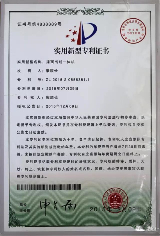 揉面出劑一體機(jī)專利證書