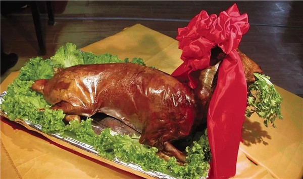 《詩經•大雅•生民》有云:“取羝以軷,載燔載烈。以興嗣歲!鄙瞎艜r已有烤全羊的記載,先民用之祭祀。到了元代,得以盛行,以肉質纖維脆而不糊,油而不膩,成為傳統名菜?救蚺c北京烤鴨、廣州脆皮乳豬相媲美。高級筵席中,如果有烤全羊餐車出現在賓客們中間,整臺筵席將頓時生輝,顯得格外豪華闊綽,為飲宴增添了異常豐富的色彩。