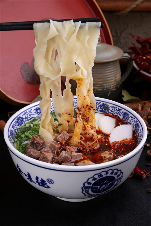 面寬約8mm左右。一般要撕紙五手成型。碗中面條根根分明,筋道有彈性,富有嚼勁,有濃郁豪俠氣。