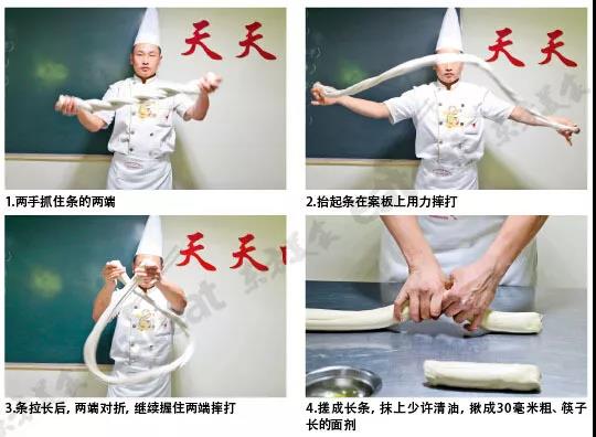 由膀圓力大的廚師將大團軟面反復搗、揉、抻、摔后,將面團放在面板上,用兩手抓住條的兩端,抬起在案板上用力摔打。條拉長后,兩端對折,繼續握住兩端摔打,如此反復,其目的是調整面團內部面筋蛋白質的排列順序,使雜亂無章的蛋白質分子排列成一條長鏈,業內稱其為順筋、溜條。然后搓成長條,抹上少許清油,揪成30毫米粗、筷子長的一條條面劑,或搓成圓條。