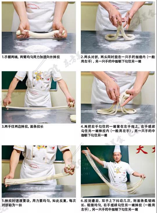 拉面是一手絕活,手握兩端,兩臂均勻用力加速向外抻拉,然后兩頭對折,兩頭同時放在一只手的指縫內(一般用左手),另一只手的中指朝下勾住另一端,手心上翻,使面條形成絞索狀,同時兩手往兩邊抻拉,面條拉長后,再把右手勾住的一端套在左手指上,右手繼續勾住另一端抻拉。抻拉時速度要快,用力要均勻,如此反復,每次對折稱為一扣。抻拉是一個技術性很強的工作,初學者很難掌握要領,同樣的面團,在有經驗的師傅手中,不但拉面的速度快(一般只需10秒鐘左右),且拉出來的面條粗細均勻,不斷裂,初學者可能不太容易做到。一個面節正好拉一大碗面,每拉一下,要在手腕上回折一次,拉到最后,雙手上下抖動幾次,則面條柔韌綿長,粗細均勻,一般大寬拉3扣,寬面拉4扣,二細拉5扣,細的拉6扣,毛細拉7扣,一窩絲拉8扣,條細如絲,且不斷裂。