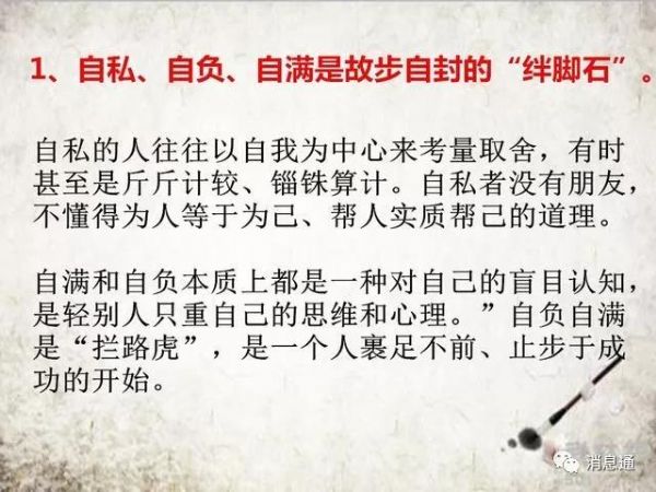 1、自私、自負、自滿是故步自封的“絆腳石”。