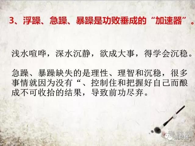 3、浮躁、急躁、暴躁是功敗垂成的“加速器”。