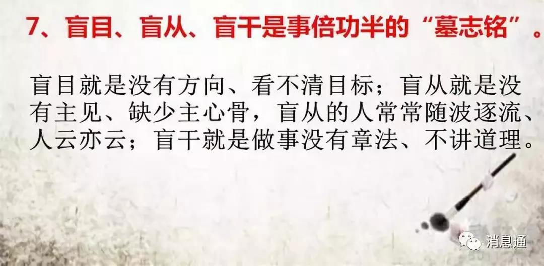 7、盲目、盲從、盲干是事倍功半的“墓志銘”。