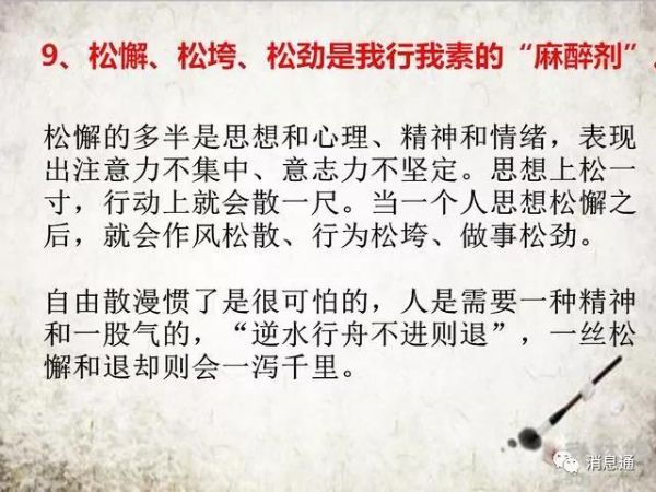 9、松懈、松垮、松勁是我行我素的“麻醉劑”。