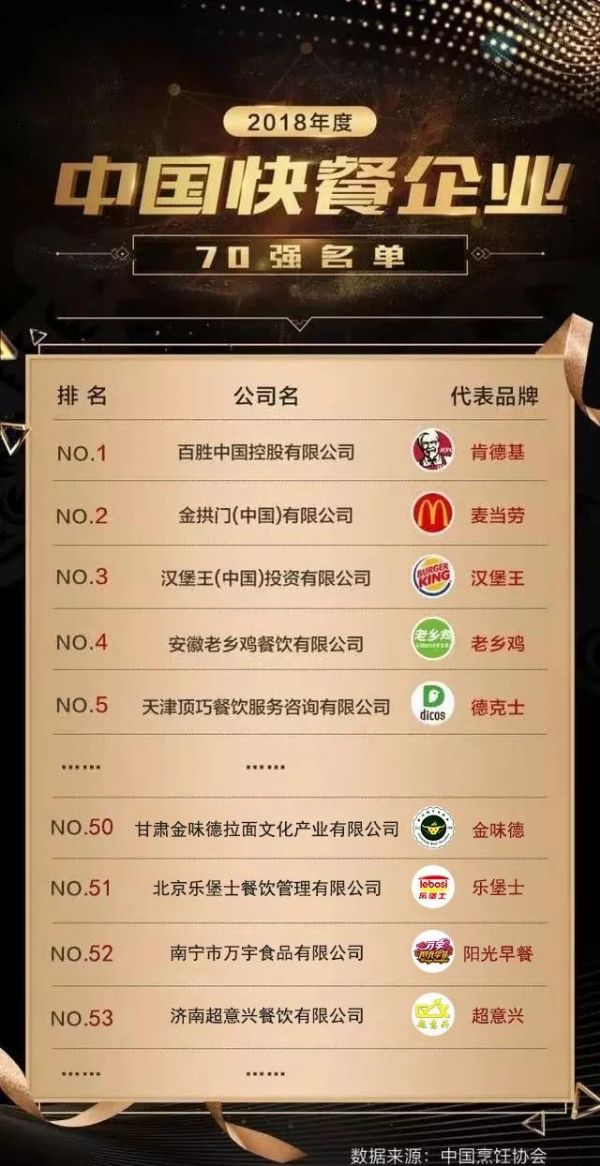10月11日,中國快餐產(chǎn)業(yè)大會于大連召開,中國烹飪協(xié)會在會上頒布了“2018年度中國快餐70強(qiáng)榜單”。這個榜單的Top 3是再熟悉不過的面孔:肯德基(百勝中國,旗下還有必勝客等)、麥當(dāng)勞(金拱門)、漢堡王。