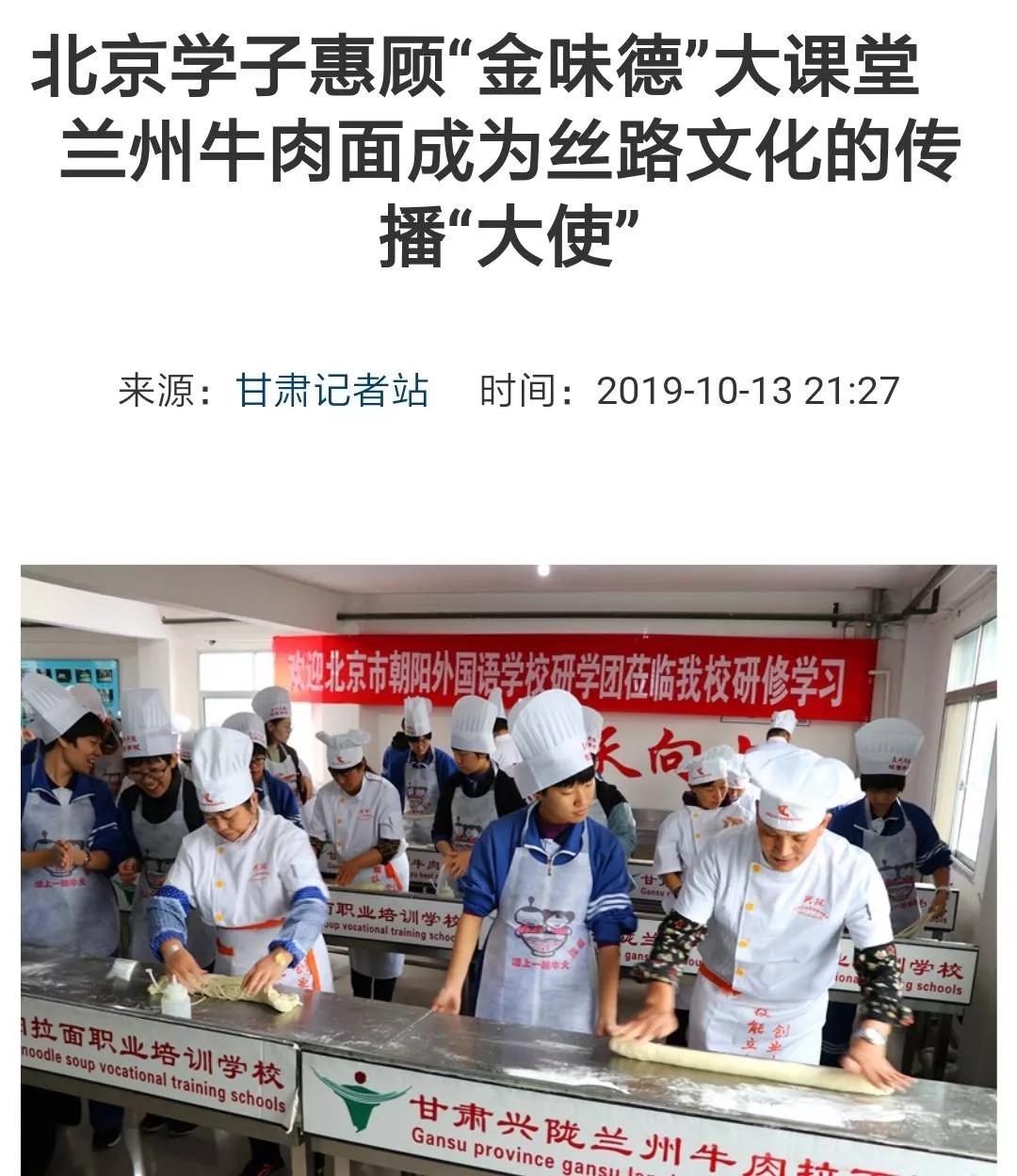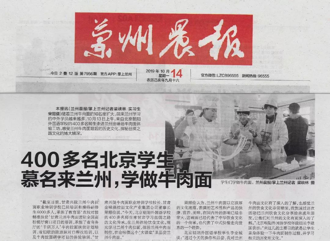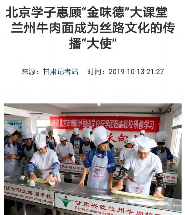 蘭州牛肉拉面享譽(yù)世界,10月12-13日兩天,來(lái)自北京朝陽(yáng)外國(guó)語(yǔ)學(xué)校的400多名師生走進(jìn)蘭州金味德,感受蘭州牛肉面背后的歷史文化,探秘絲綢之路博大精深。獲得多家媒體爭(zhēng)相報(bào)道。