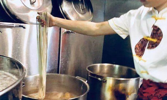 拉面師傅專門從蘭州而來,功夫了得。不僅臂力過人,而且對拉面力道的控制剛中帶柔。下到鍋里依舊韌性十足!