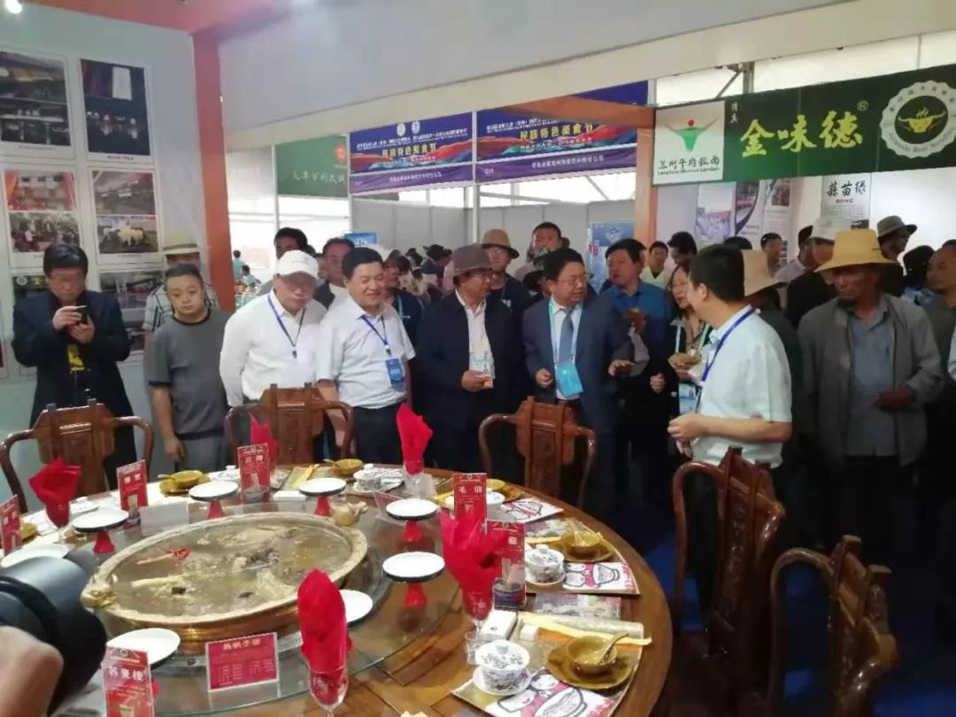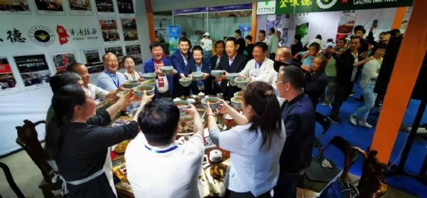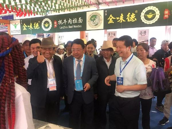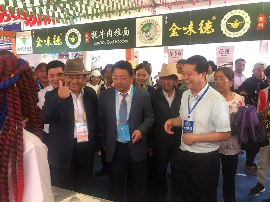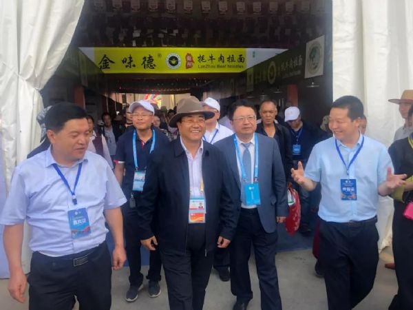 下午,甘肅省商務廳副廳長任?担誓现萑舜蟪N瘯魅伟插\龍與諸位領導親臨名族特色美食會場參觀。金味德拉面文化產業集團董事長梁順儉陪同參觀金味德牛肉拉面展館主會場。