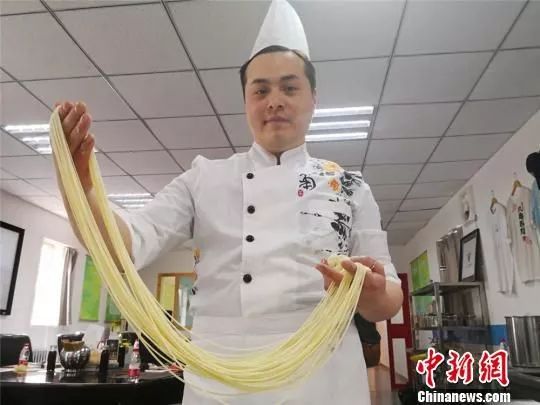 來自哈薩克斯坦的留學生赤龍展示拉出的“毛細”面型。毛細是牛肉面中最細的一道面食,成型后“細如發(fā)絲”。 史靜靜 攝