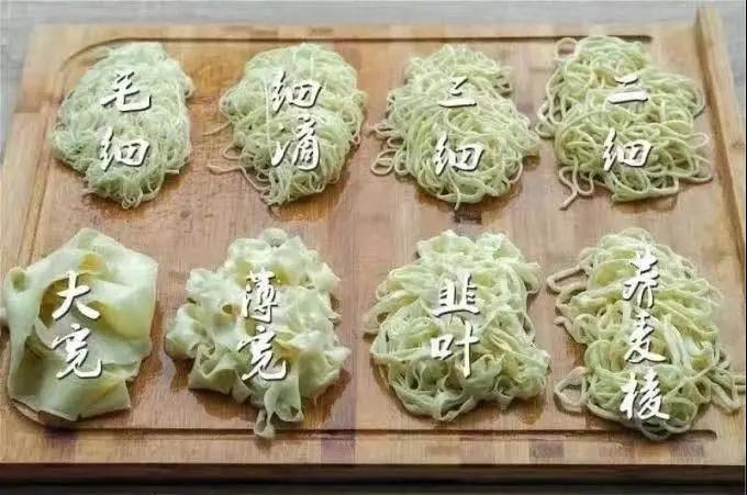 金味德的師傅對美食有著嚴謹?shù)膽B(tài)度,根據(jù)食客的喜好師傅會拉出大小粗細不同的面條,扁型面從細到寬分為:韭葉、薄寬、寬滴、大寬圓型面從粗到細可以分為:二細、三細、細滴、毛細來一張毛細與大寬的對比圖: